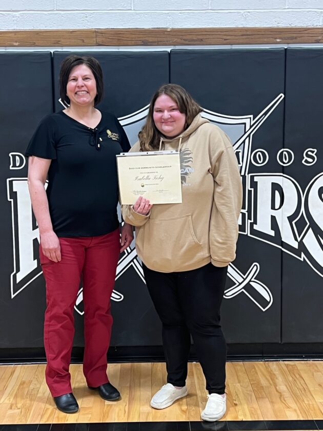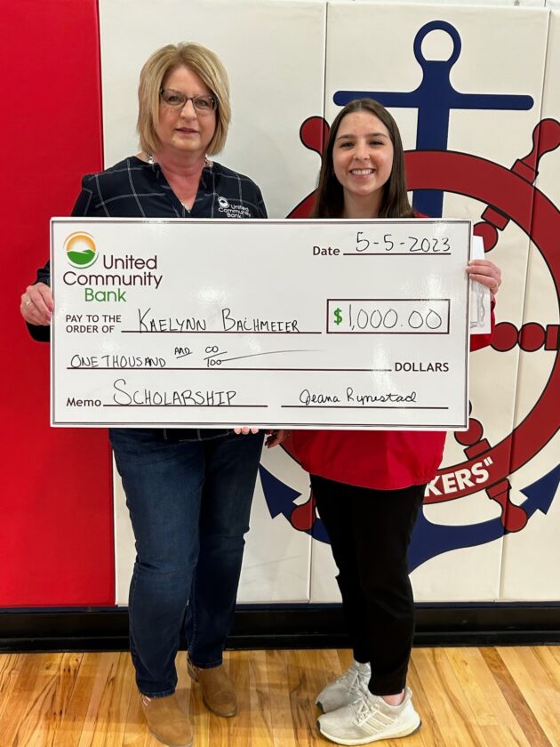 - Submitted Photo Des Lacs-Burlington High School student, Kaelyn Bachmeier (right), received her $1,000 scholarship from UCB employee, Jeana Rynestad (left), on May 5.