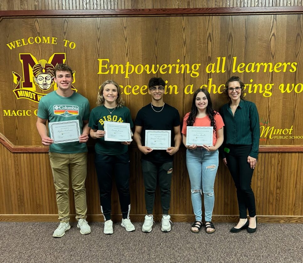 - Submitted Photo Minot High School students pose with a UCB employee, Jennifer Hubrig, after receiving their scholarship certificates. From left to right: Ryker Pederson, Trinity Jessen, Daniel Fernandez, Aubrey Mueller, Hubrig.