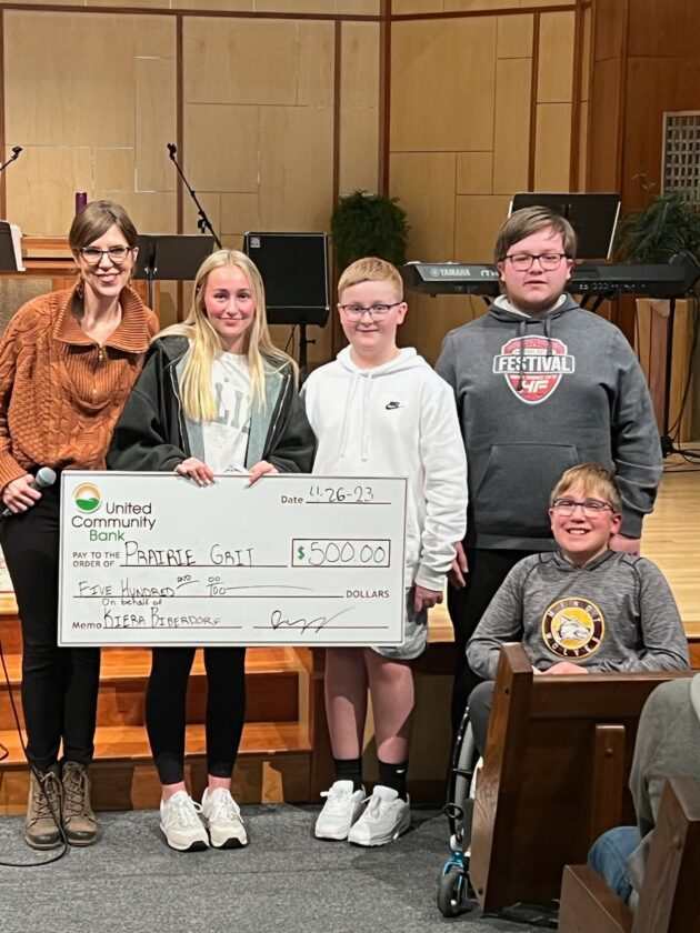 - Submitted Photo Our Redeemer’s Christian School student presents Prairie Grit Sports with a $500 donation on April 26. From left to right: Jennifer Hubrig, Kiera Biberdorf, Owen Kersten, Carter Kersten, Palmer Thompson.