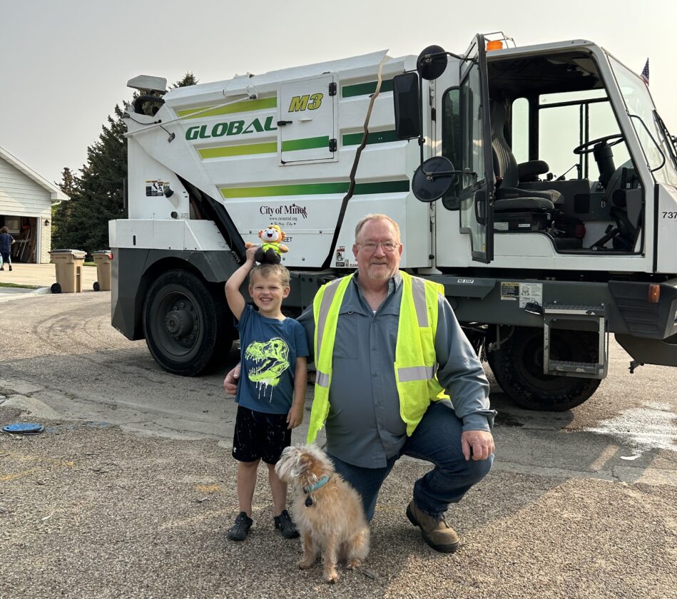 - Isaiah Gipson, 6, and City of Minot sanitation truck driver Daltyn Lakoduk pose for a photo before Isaiah gets his ride to kindergarten at Longfellow Elementary in the garbage truck. Isaiah was winner of a drawing at a Public Works Department open house Tuesday that entitled him to the special ride.