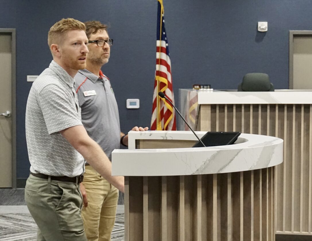 Jill Schramm/MDN Cole Krueger, front, and Dan Conn, back, with Minot State University, address the Minot Childcare Committee in Minot City Hall Thursday.