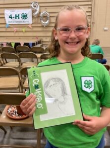 - Demy Braaten, a member of the Cloverbuds, poses with her drawing at last year’s Achievement Days 90th anniversary. The Cloverbuds, the youngest 4-H members, are ages five to seven.