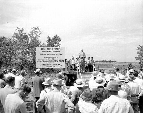 MDN File Photo Sixty-eight years ago, a groundbreaking ceremony was held north of Minot for the project to build an Air Force base described as “North Dakota’s first major military installation” and the culmination of a two-year dream.” In this photo, Dr. A.L. Cameron, director in charge of the Military Affairs Committee, Minot Chamber of Commerce, extends greetings to the crowd of about 200 people during the groundbreaking ceremony held Tuesday afternoon, July 12, 1955, for the Minot jet interceptor base that would become Minot Air Force base. Today, the base is the only dual wing, nuclear-capable base in the Air Force, hosting two legs of the U.S. Nuclear Triad. The 5th Bomb Wing has B-52s and the 91st Missile Wing oversees Minuteman III intercontinental ballistic missiles in the Minot missile field.