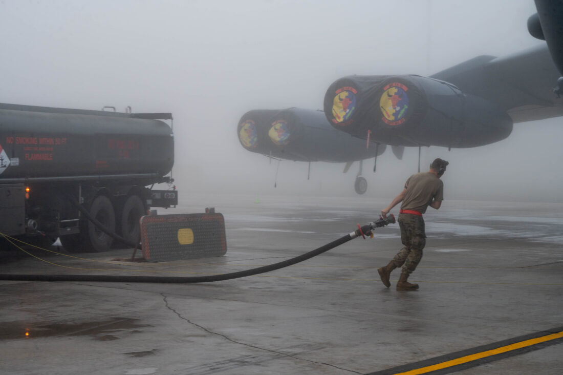- A 5th Bomb Wing fuels team member prepares to fuel a B-52H Stratofortress at Minot Air Force Base on Aug. 24 in this Air Force photo by Airman 1st Class Alexander Nottingham. Having a fuel capacity of 312,197 pounds, the B-52H is prepared whenever and wherever it is needed by a fuels team working around the clock.