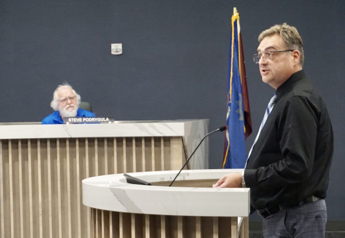 Jill Schramm/MDN Chris Plank, Minot’s National Disaster Resilience grant manager, speaks to the Minot City Council Tuesday during discussion on Minot’s designation as a Metropolitan City. At left is council member Stephan Podrygula.