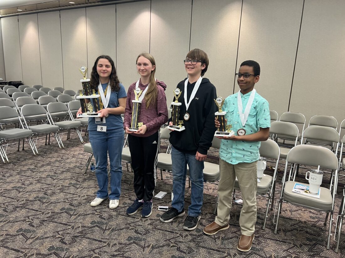 Submitted Photo The top four finishers in the State Spelling Bee, held March 18 at the Bismarck Civic Center, are, from left, Luna Gasevic, Cass County, first place; Merryn Johnson, Cass County, second place; Kale Tebelius, Stutsman County, third place; and Chilaka Ugobi, Ward County, fourth place.