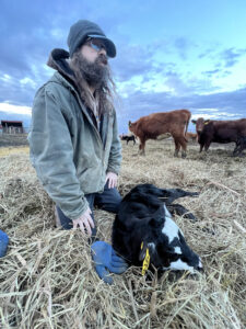 - Submitted Photo Luke Erickson kneels next to a newborn calf on April 10 at Diamond T Ranch, south of Minot.