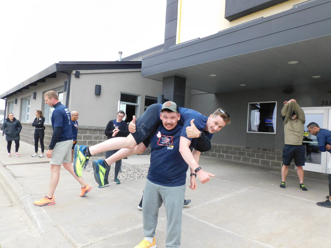 - Jacob Olson hoists Andrew Hess at the end of the 2024 Special Olympics North Dakota Torch Run on South Broadway on Wednesday.