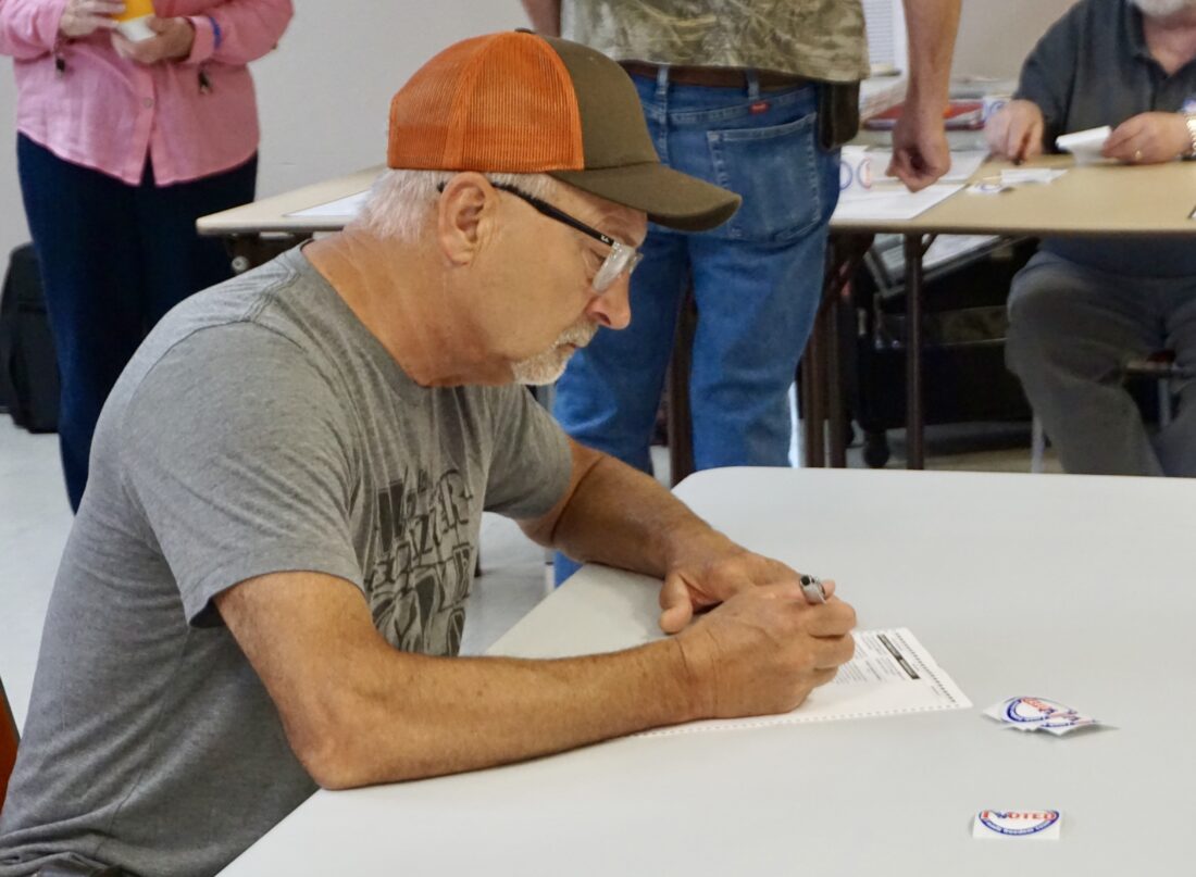 - Jill Schramm/MDN Stacy Zietz looks over his ballot as he votes Tuesday in Burlington City Hall.