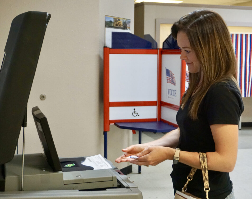 - Megan Indvik holds an “I Voted” sticker as she watches her ballot slip into the scanner at the Burlington City Hall poll on Tuesday.