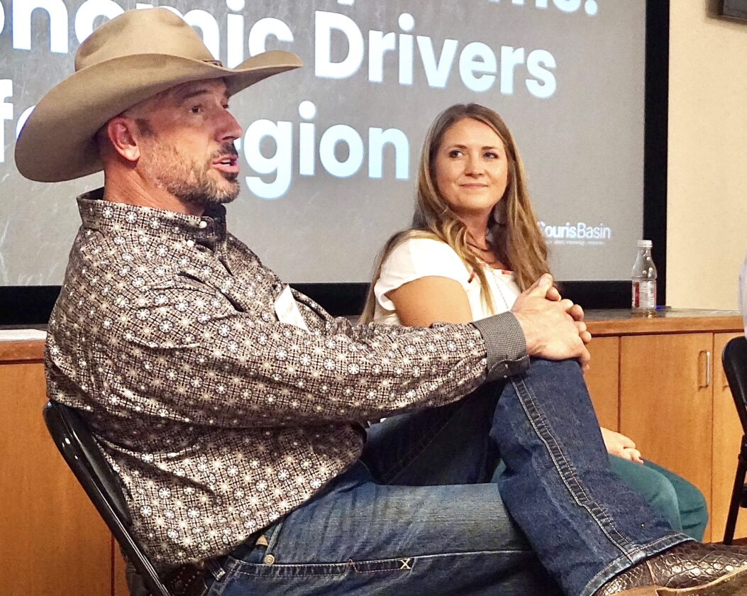 Jill Schramm/MDN Phillip Newman with Mema’s Meats in Berthold speaks about local foods on a panel with Ashley Bruner, right, with Dakota Angus Beef in Drake at Souris Basin Planning Council’s State of the Region event in Velva Thursday.