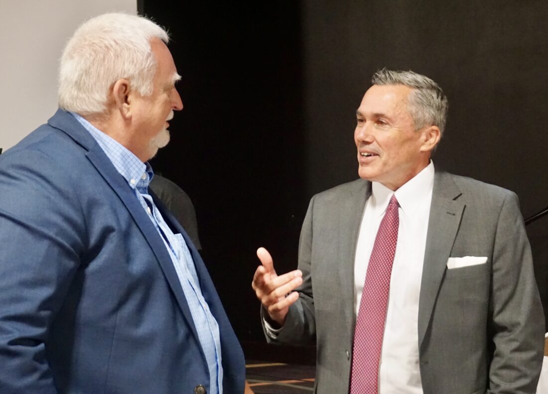 Jill Schramm/MDN State Sen. David Hogue talks with Perry Erdmann following his presentation Monday on the North Dakota measure to abolish property taxes.