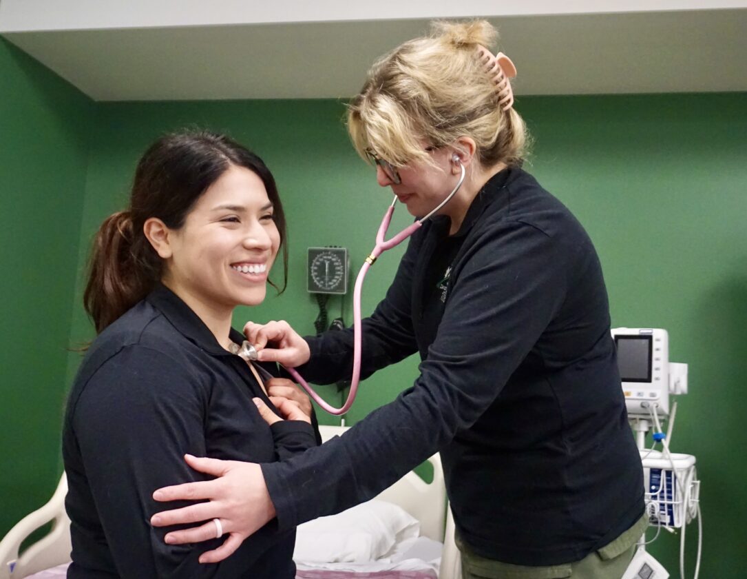 Jill Schramm/MDN Deanna Sonderegger conducts a heart check on fellow student Rocio Reina on Oct. 7 during a Dakota Nursing College class in Minot. The program has moved into a new building that is being considered for a new allied health institute.