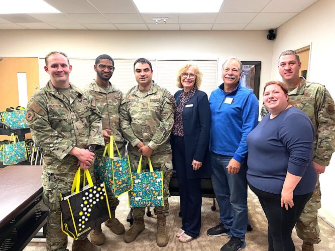 Holding “Welcome Bags” with baby supplies donated by the Minot Elks are, from left, Tech. Sgt. Matthew Hugaboom, Tech. Sgt. Joseph Amador and Tech. Sgt. Ramon Burgos. Continuing from left are Carolyn Bodell, Elks secretary; Jim Bodell, Elks Exalted Ruler; Alyssa Poth, Family Readiness Program director; and Senior Master Sgt. Cephus Mintor, Dads 101 instructor.