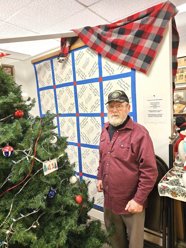 Ben Pifher/MDN Not quite hidden between Christmas trees is a quilt pointed out by Ray Iverson. The quilt was hand stitched by the Max Mother’s Club with the names of 200 veterans who served in World War II. Iverson pointed to his father’s name, also Raymond Iverson, embroidered on it. He said the quilt is his most precious possession.