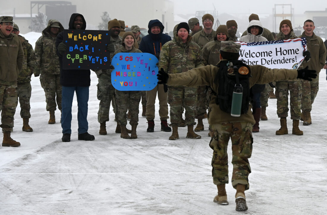 - Members of the 5th Communications Squadron at Minot Air Force Base greet an airman returning home on Dec. 23 from a deployment. U.S. Air Force photo by Tech. Sgt. Rusty Frank.