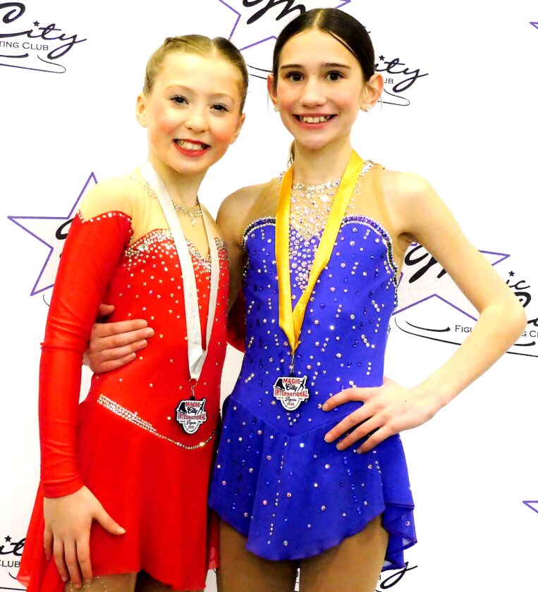 Elizabeth Hendrickson MDN Minot skaters Marin Sorum, left, finished second and Maddie Kirkhammer, right, finished first in Free Skate in the Magic City International Figure Skating Competition this past weekend.