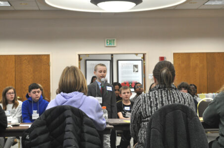 - Charles Crane/MDN Miller Merkel stands at the microphone during the opening round of the spelldown at the Ward County Spelling Bee at the Minot State University Student Union on Wednesday.