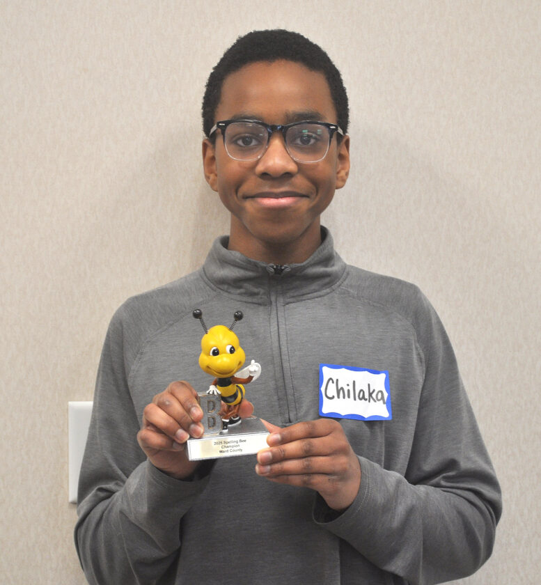 - Charles Crane/MDN Chilaka Ogobi of Our Redeemer’s Christian School poses with his first-place trophy after conquering the spelldown at the Ward County Spelling Bee on Wednesday.