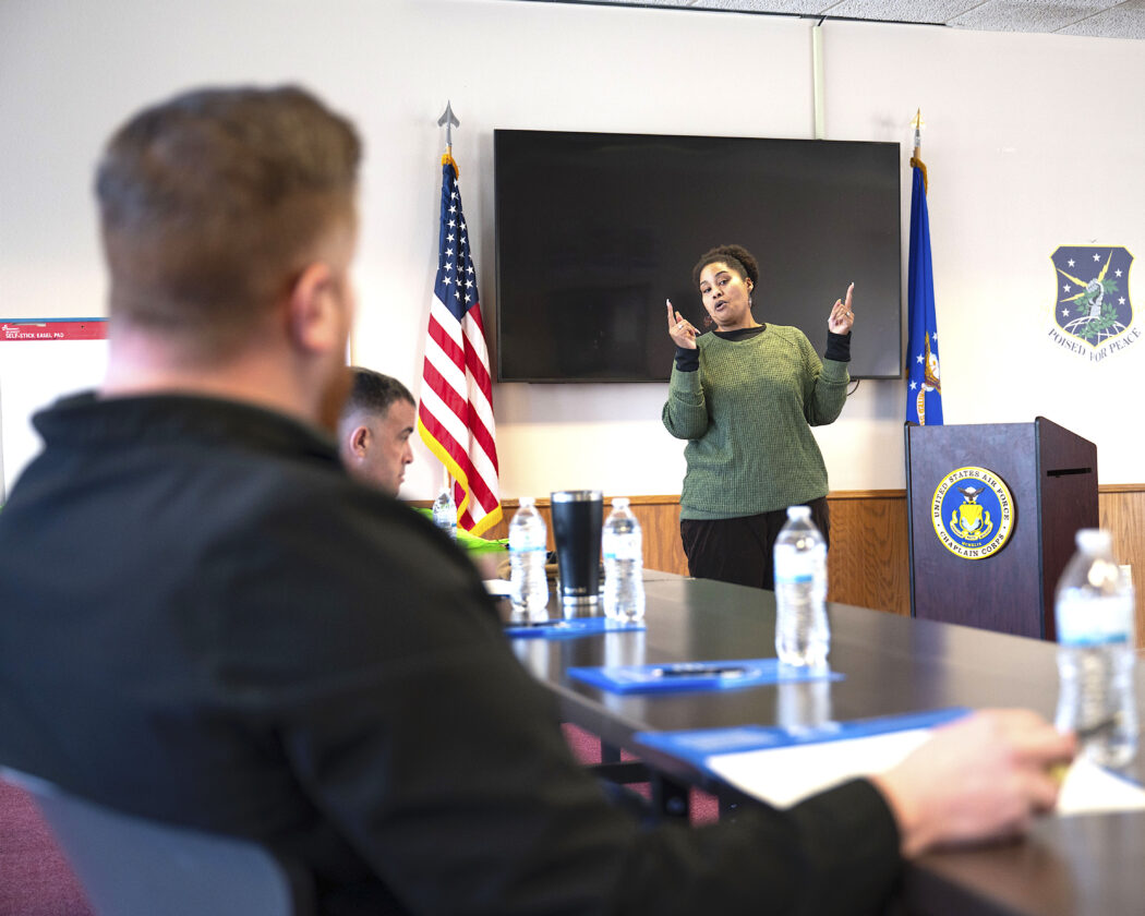 Submitted Photo Tawana Hixon, a psychology technician for the 91st Missile Wing, speaks during the True North-Minot Installation Cohesion Meeting 2025 at the Northern Lights Chapel on Minot Air Force Base on Feb. 12. Hixon and other True North members held a discussion about stressors and trends commonly seen in their line of work and how to address those issues. True North is a resilience program that provides service members and their families with integrated mental health support and consists of support teams that are directly embedded into Air Force units. U.S. Air Force photo by Senior Airman Kendra A. Ransum.