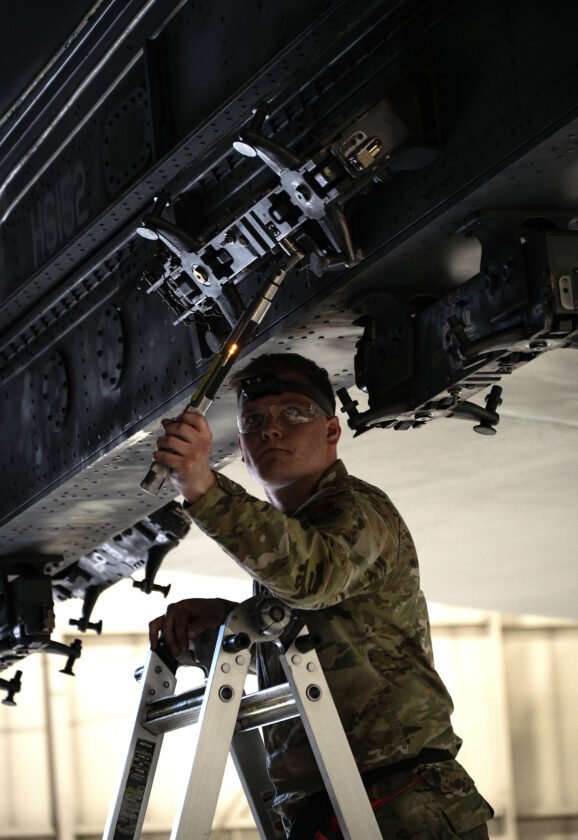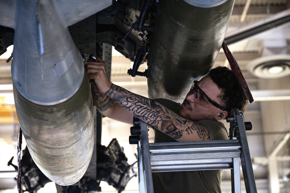Senior Airman Nicholas Bowden, 69th Bomber Generation Squadron load crew member, secures an inert GBU-31 Joint Direct Attack Munition to a B-52H Stratofortress during the 1st Quarter Weapons Load Competition at Minot Air Force Base on May 2. Weapons load competitions play a significant role in enhancing mission readiness and strengthening global strike capabilities.