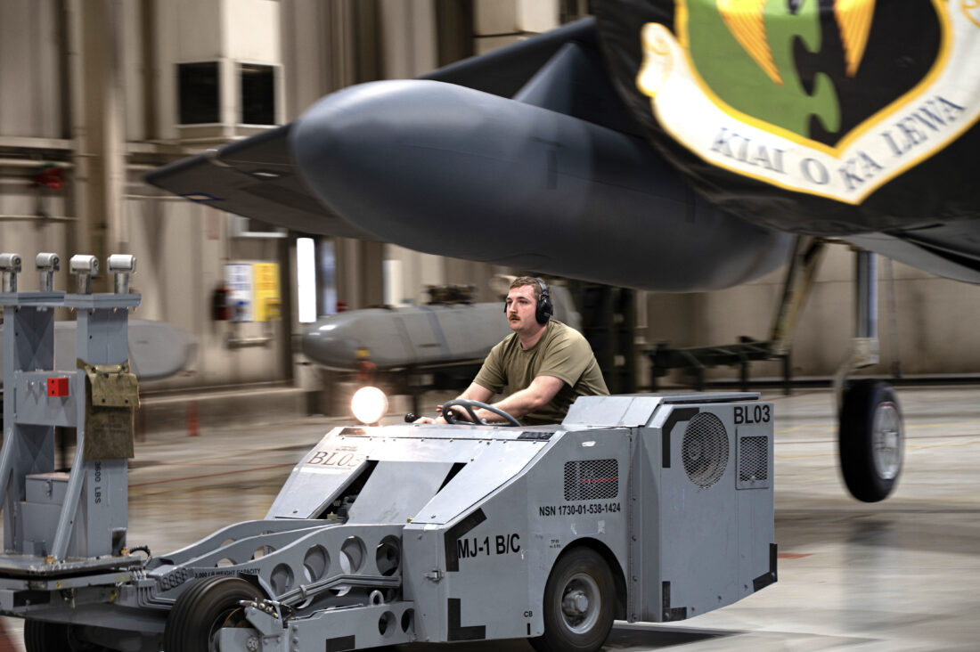 Senior Airman Joshua Boyle, 69th Bomber Generation Squadron load crew member, drives a missile carrier during the 1st Quarter Weapons Load Competition at Minot Air Force Base on May 2. For the inert munition to be loaded onto the aircraft safely and effectively, the crew must always have precise control over it. U.S. Air Force photos by Senior Airman Alyssa Bankston.
