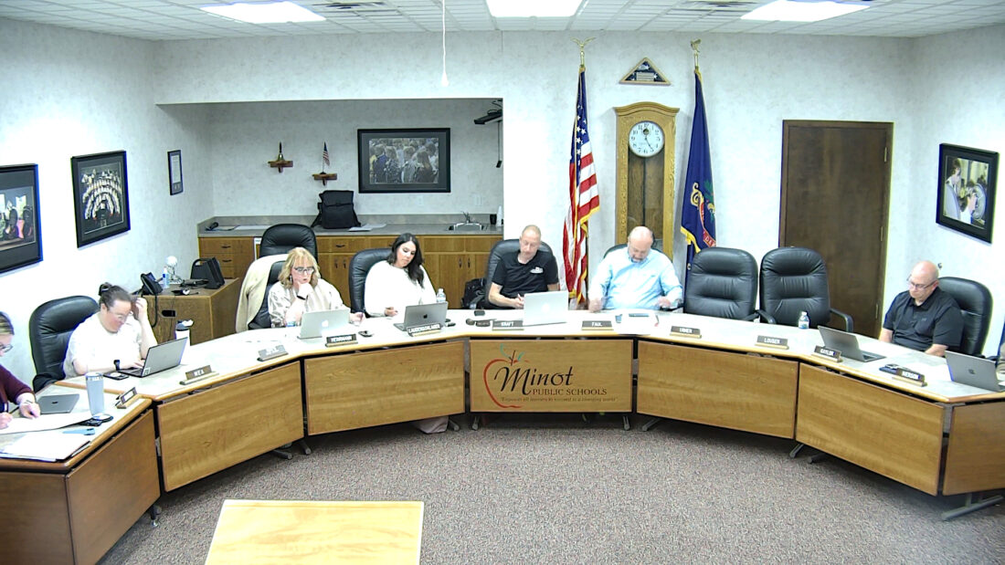 Screen Photo The Minot Public School Board is shown after the vote approving the relocation of Souris River Campus from the Quentin Burdick Job Corps facility to the empty McKinley Elementary School building at its meeting on Thursday.