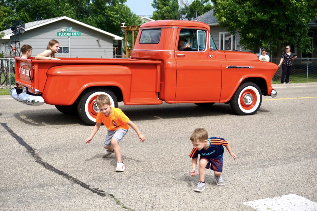 - Jill Schramm/MDN Brothers Curtis, left, and Odin Trottier of Surrey race to collect candy tossed by passengers in one of the classic vehicles entered in the Surrey Quasquicentennial parade Saturday.