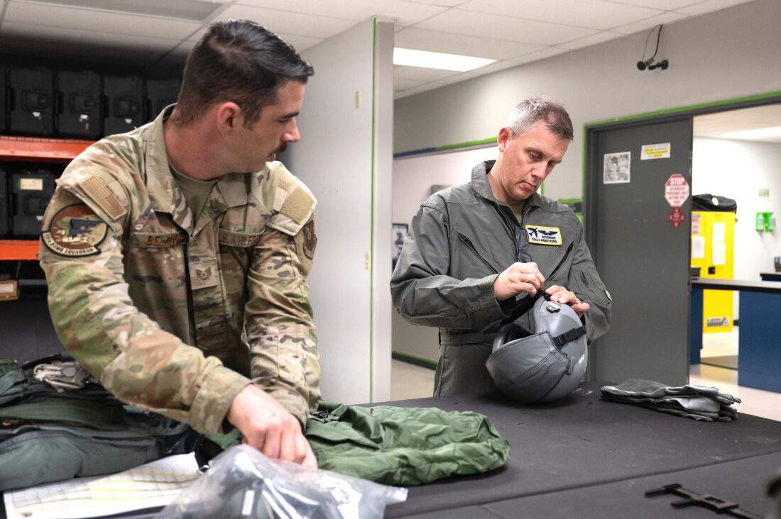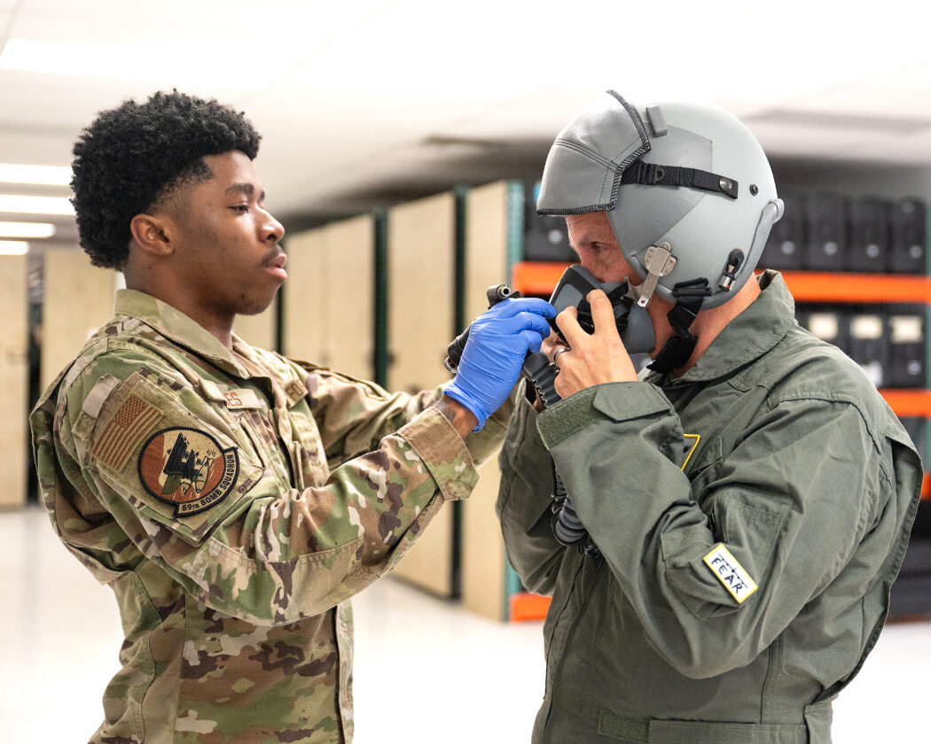 - North Dakota Gov. Kelly Armstrong (right) receives assistance with his fitting his oxygen mask from Airman 1st Class Jahleel Wages, 69th Bomb Squadron aircrew flight equipment technician, at Minot Air Force Base, North Dakota, June 30, 2025. The governor was greeted by base leadership, received flight safety training and flew with 69BS aircrew on B-52H Stratofortress over Bismarck, North Dakota. (U.S. Air Force photo by Senior Airman Kendra A. Ransum)