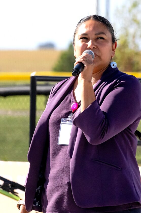 - Submitted Photo Dr. Bernice DuBois, a doctor at the Parshall clinic who was raised in White Shield, speaks at the Back-to-School Bash held in White Shield Monday, Aug. 11.