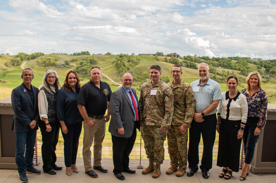 Submitted Photo Planners and supporters of the Military Gallery being built in Bismarck taking part in a recent campaign event in Minot are, from left, Arnold Strebe, North Dakota National Guard Foundation; NDNG Lt. Col. (retired) Shirley Olgeirson, NDNG historian; Brekka Kramer, president/CEO, Minot Area Chamber EDC; Lt. Col. Derek Kuntz, director, Strategic Plans and Policy, N.D. National Guard; Bill Peterson, director, State Historical Society of N.D.; U.S. Air Force Col. Michael Suden, commander, 91st Operations Group, Minot Air Force Base; U.S. Air Force Col. Thomas Taylor, deputy commander, 5th Bomb Wing, Minot AFB; Dale Lennon, executive director, SHSND Foundation; Brig. Gen. Jackie Huber, president, NDNG Foundation and NDNG deputy adjutant general; and Michelle Brislin, Military Gallery Capital Campaign consultant, PACE Fundraising.