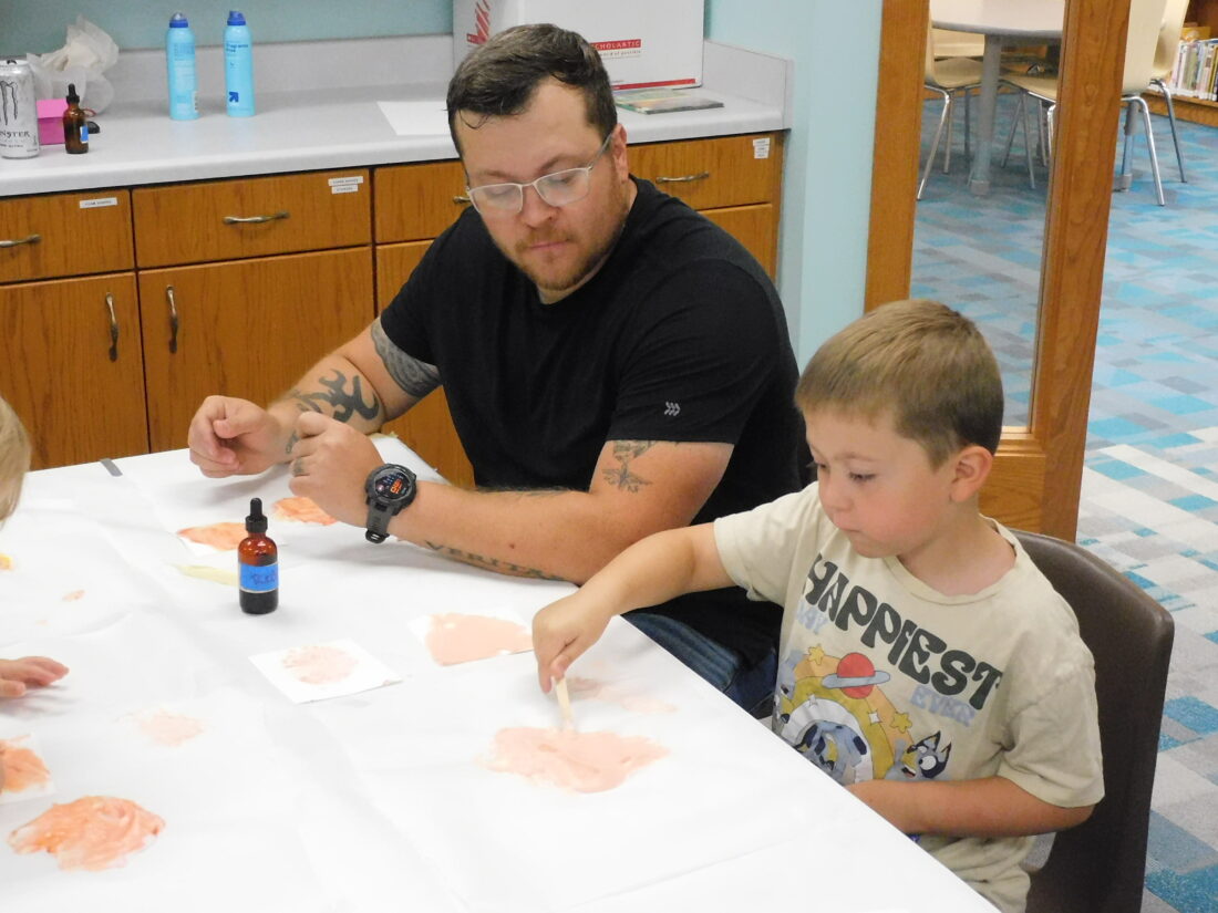 Children were creating art with shaving cream and food coloring while learning about nature at the latest gathering of Nature Explorers at Minot Public Library Thursday, Aug. 7.