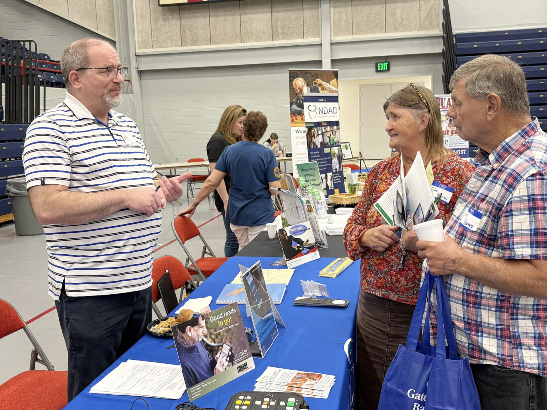 Steve Hammel, left, Patron Services director at the North Dakota State Library in Bismarck, visits with Julie and Larry Korner of Williston, who collected a variety of informational materials in checking out the booths at the Parkinson’s Symposium in Minot Wednesday, Sept. 17.