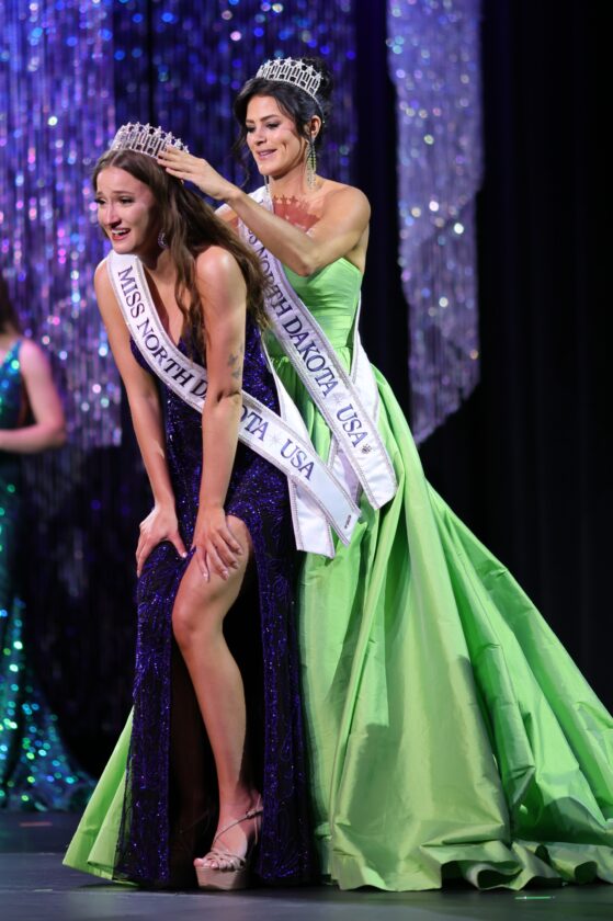 Submitted Photo Olivia Redding is crowned Miss ND USA 2025 by Codi Miller at the Miss ND USA pageant in Des Moines, Iowa, on Aug. 8.