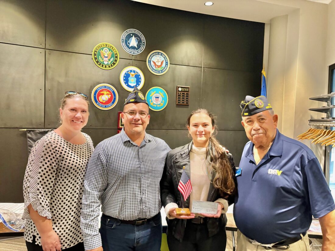 Submitted Photo Grace Alvarez, third from left, a student at Minot State University, was awarded the $1,000 Bob Fix Memorial Scholarship from the Disabled American Veterans (DAV) Chapter 4 during its Thursday, Sept. 11, business meeting. From left to right are Grace Alvarez’s parents, Sommer and Eric Alvarez, Grace Alvarez and Ron Garcia, DAV Chapter 4 scholarship coordinator.