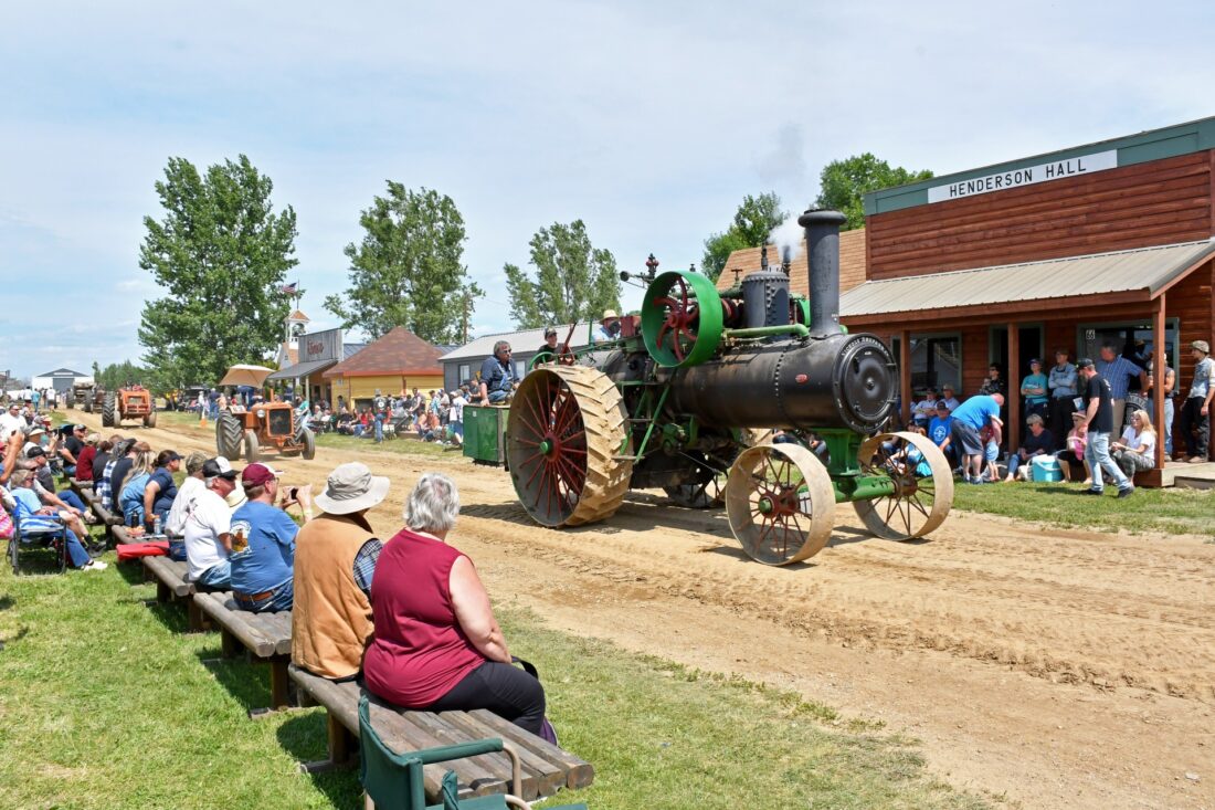 - by Roger Riveland A 1912 25-85 HP Nichols and Shepard side mount steam tractor drives the parade route during the 56th Annual Divide County Threshing Bee in Crosby. The bee, held July 18-20, was well attended with parade entries from other states and Canada. Besides the main parade each day, the event included an antique flea market, music by Chokecherry Jam on Friday and by The Jensen Sisters on Saturday. Other events included a large farm toy show, bingo, car show, stationary engine displays, rye grain threshing, plowing and working saw mill demonstrations. A church service was held at the old Daneville church Sunday morning on site at the Pioneer Village, where many other historical buildings from around the area now reside. New this year was an opportunity to ride or drive a tractor.