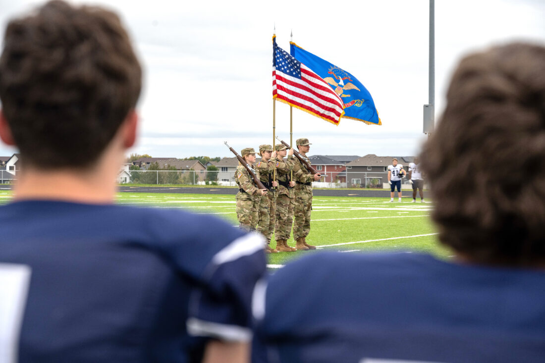 Members of the Minot Air Force Base Honor Guard present the colors during the National Anthem before the Minot North High School football game at Sentinel Stadium in Minot Friday, Sept. 19. The ceremony preceded a UH-1 Iroquois arrival carrying 5th Bomb Wing and 91st Missile Wing leadership for the game’s opening kickoff.