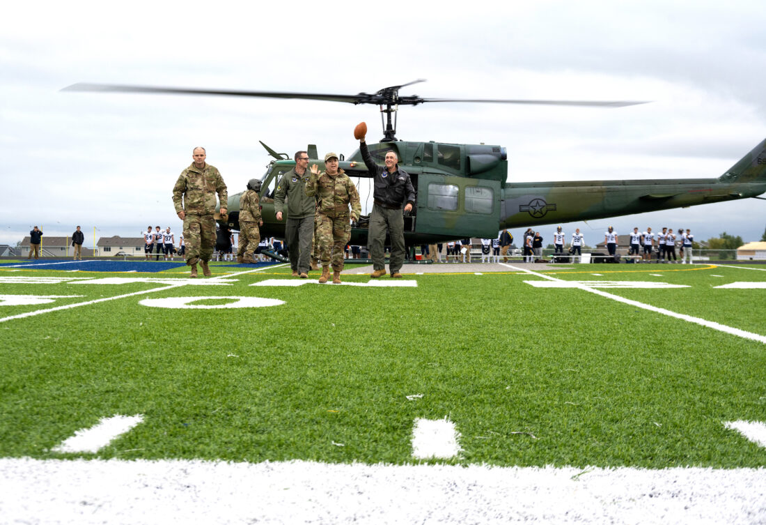 Minot Air Force Base’s 5th Bomb Wing and 91st Missile Wing leadership deliver the game ball at Sentinel Stadium for the Minot North High School football game in Minot Friday, Sept. 19. The pre-game ceremony highlighted the partnership between Team Minot and the local community.