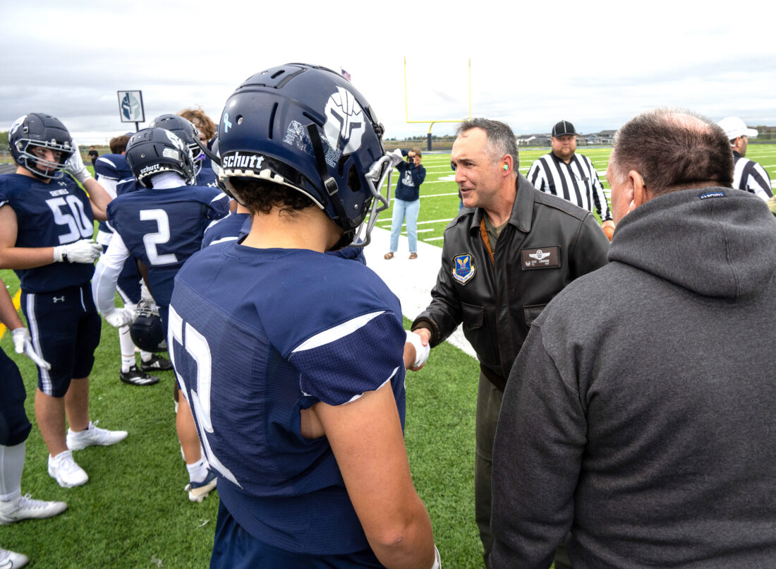 Col. Jesse Lamarand, 5th Bomb Wing commander, shakes hands with a Minot North High School football player prior to the homecoming game at Minot Friday, Sept. 19. Leaders from the 5th Bomb Wing and 91st Missile Wing participated in pre-game ceremonies to deliver the game ball. U.S. Air Force photos by Senior Airman Luis Gomez.