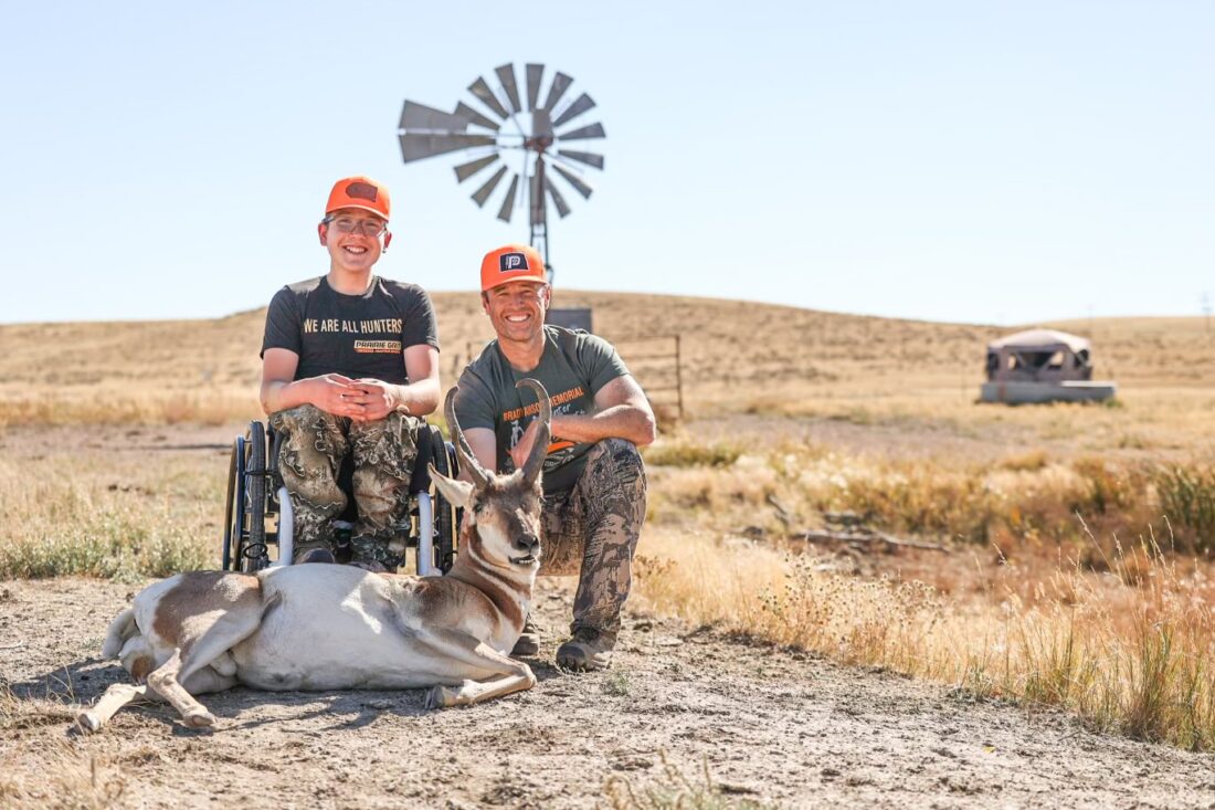 Palmer Thompson, left, and his father, Chad Thompson, right, pose with an antelope during a Prairie Grit hunting trip. Photo courtesy of Angie Thompson.