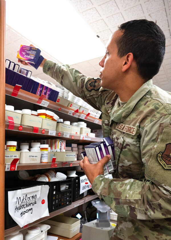 Airman 1st Class Zeek Allen, an augmentee from the 791st Missile Security Forces Squadron, stores away filled medications at the 5th Medical Group building on Minot Air Force Base Monday, Aug. 18. The pharmacy provides essential medications to service members, their families and military retirees.