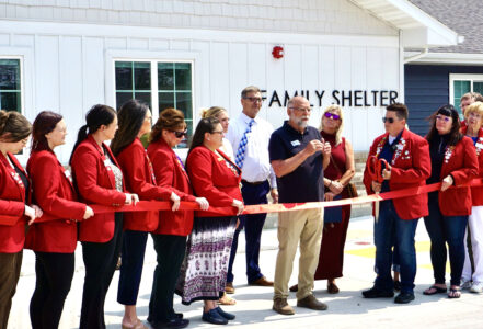 Mark Jantzer, now Minot mayor, speaks at a ribbon cutting July 31 in front of the family shelter at Broadway Circle prior to a ribbon cutting. At left of Jantzer is Kaitlyn Weidert, representing Sen. Kevin Cramer’s office, and at right is Sally Johnson with Sen. John Hoeven’s office. Behind them is Chris Plank, who was National Disaster Resilience manager for the city at the time.