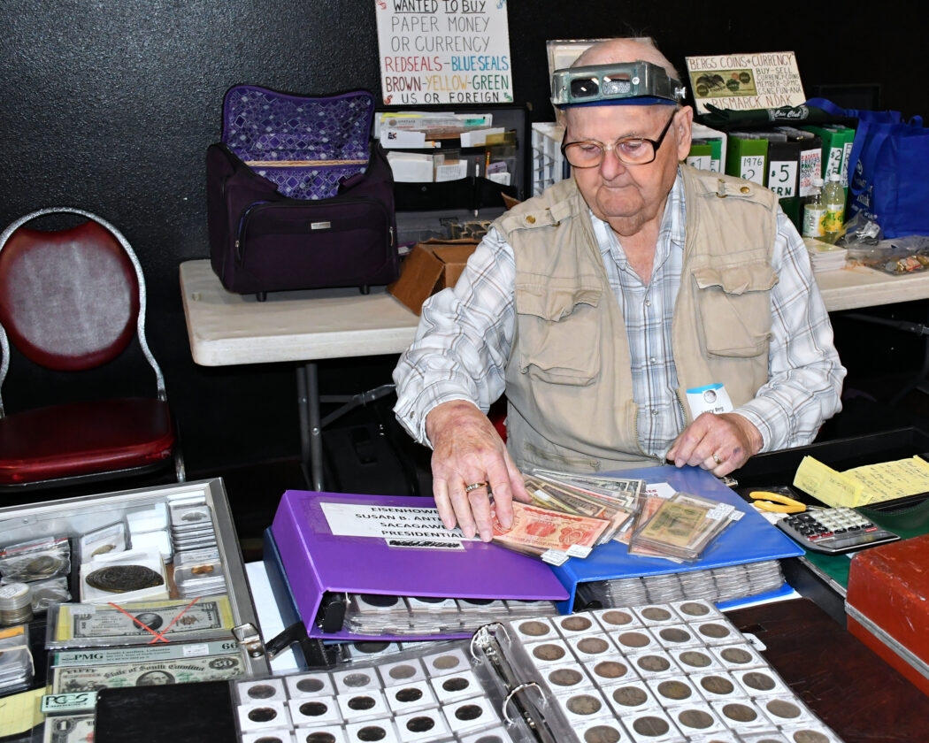Submitted Photo Larry Berg of Bismarck goes through some world currency at his booth at the 13th annual Minot Coin Club show held Saturday and Sunday, Oct. 4-5. Photo by Roger Riveland.
