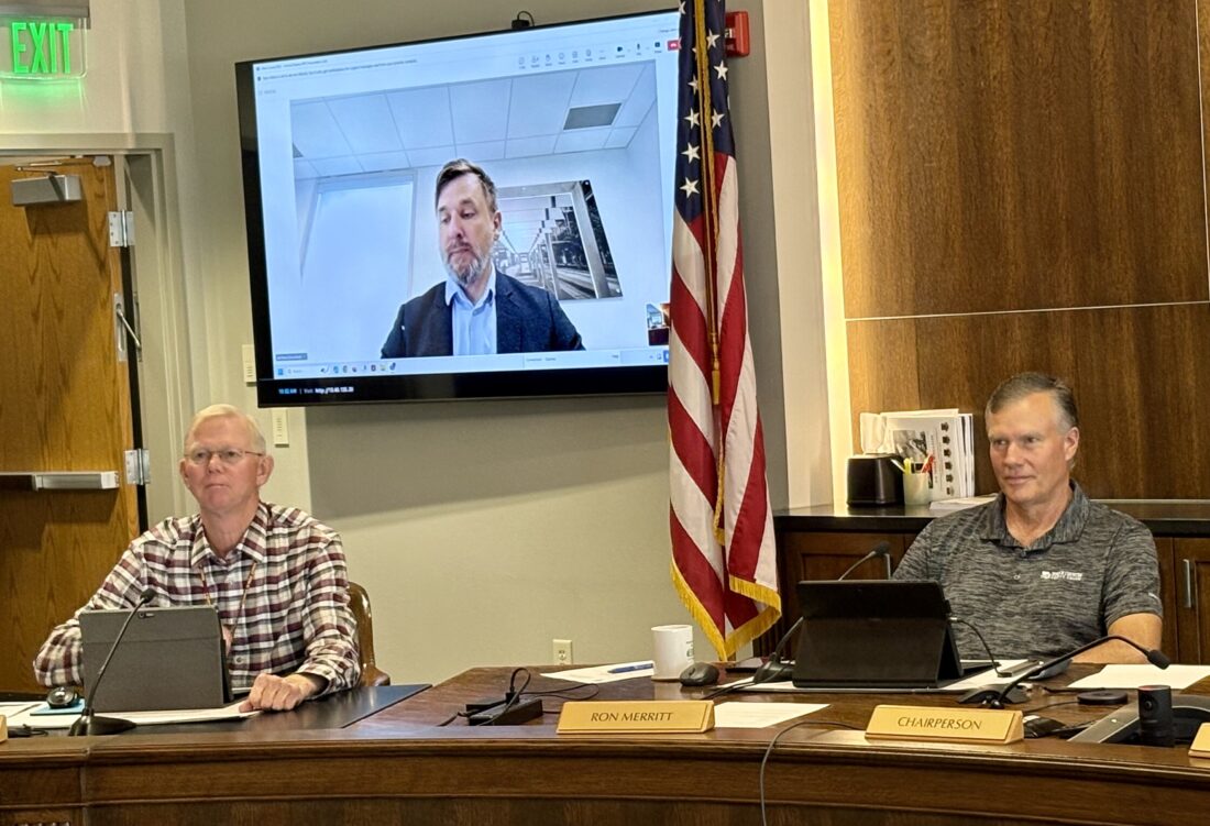 Jill Schramm/MDN Ward County Commissioners Jim Rostad, left, and Ron Merritt, right, take part in a commission discussion Tuesday, Oct. 7, on a Central Dakota Metropolitan Planning Organization transportation plan after hearing details of the proposed plan from Joel Mann with Bolton and Menk, who appears remotely on screen.