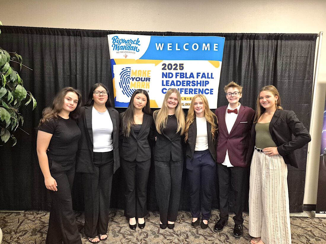 Submitted Photo MInot High School FBLA members Talia Griswold, chapter president; Nangelena Lopez, chapter reporter; Joy Jiang, chapter secretary; Abby Jenson, chapter historian; Vianne Strandlien, chapter social media coordinator; Saige Carlson, chapter vice president; and Darby Mowbray, chapter treasurer; attended the 2025 ND FBLA Fall Leadership Conference in Bismarck on Oct. 5-6.