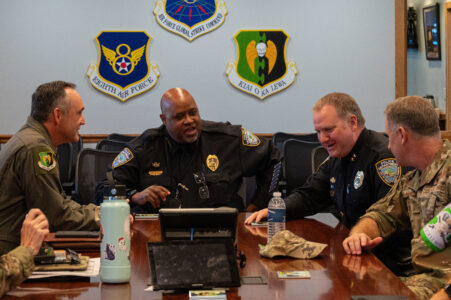 U.S. Air Force Col. Jesse Lamarand, 5th Bomb Wing commander at Minot Air Force Base; Michael Frye, Minot Police Department chief of police; Capt. Dale Plessas, Minot Police Department deputy chief, and U.S. Air Force Col. James Schlabach, 91st Missile Wing commander at Minot AFB, from left to right, visit at Minot AFB Monday, Sept. 29. The engagement included a tour of facilities and discussions aimed at supporting cooperation between the base and the local community.