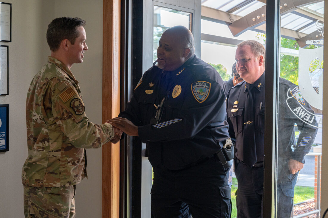 U.S. Air Force Maj. Tom Barger, 5th Bomb Wing Public Affairs chief, greets Michael Frye, chief of police of the Minot Police Department, at Minot Air Force Base, Monday, Sept. 29. At right is Capt. Dale Plessas, Minot Police Department deputy chief. The visit provided an opportunity to strengthen partnerships between installation leadership and local law enforcement to introduce the newly appointed chief of police with the mission at Minot AFB. U.S. Air Force photos by Airman 1st Class Vincent Padilla.