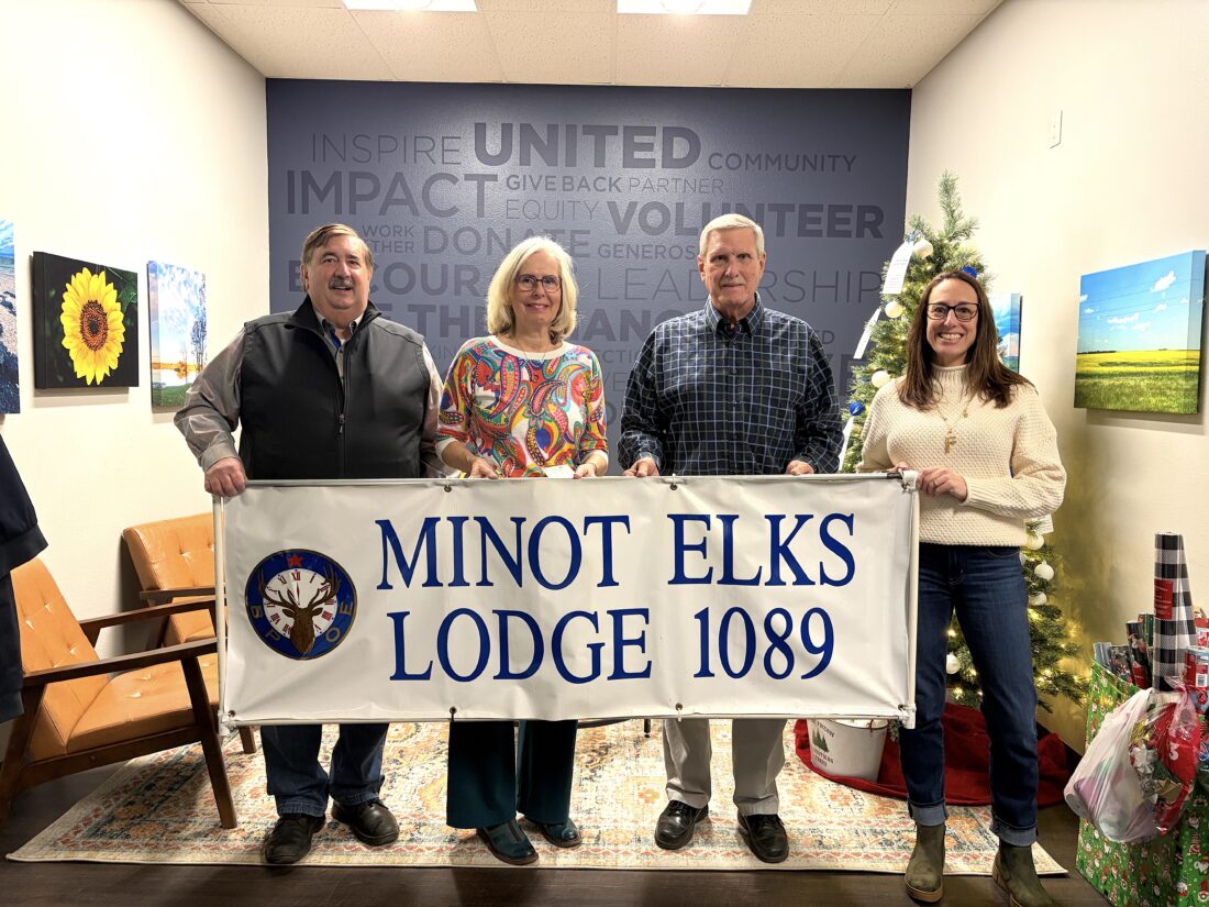 Submitted Photo The Minot Elks Lodge presents a check for $2,200 from the North Dakota Elks Association to the Souris Valley United Way’s Backpack Buddies Program. From left are Rich Matteson, treasurer; Carolyn Bodell, secretary; Larry Eidsness, trustee, and Christy Miller, SVUW executive director. The state association offered funding to each Elks lodge in the state to donate to charitable programs in their areas. Backpack Buddies provides weekend food for 586 children attending 10 elementary and two middle schools within Minot Public Schools. The program anticipates packing 17,952 bags of food during the 2025-2026 school year. The $2,200.00 donated by the Elks is enough to feed eight children for a year, with funds left over.