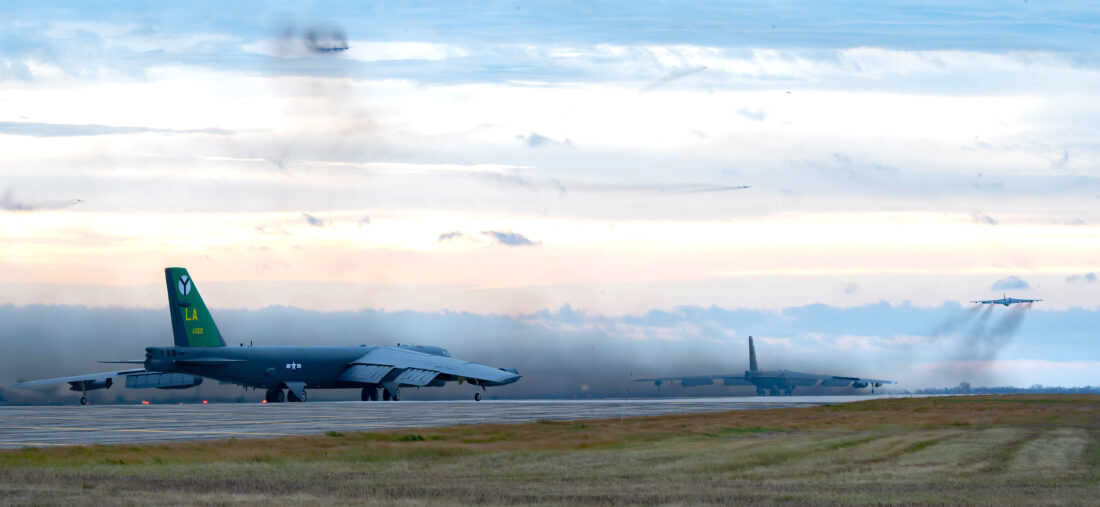Submitted Photo U.S. Air Force B-52H Stratofortresses assigned to the 2nd Bomb Wing at Barksdale Air Force Base, Louisiana, and the 5th Bomb Wing at Minot Air Force Base, take off as part of Exercise Global Thunder 26 at Minot AFB, Oct. 26. U.S. Air Force photo by Airman 1st Class Wesley Davies.