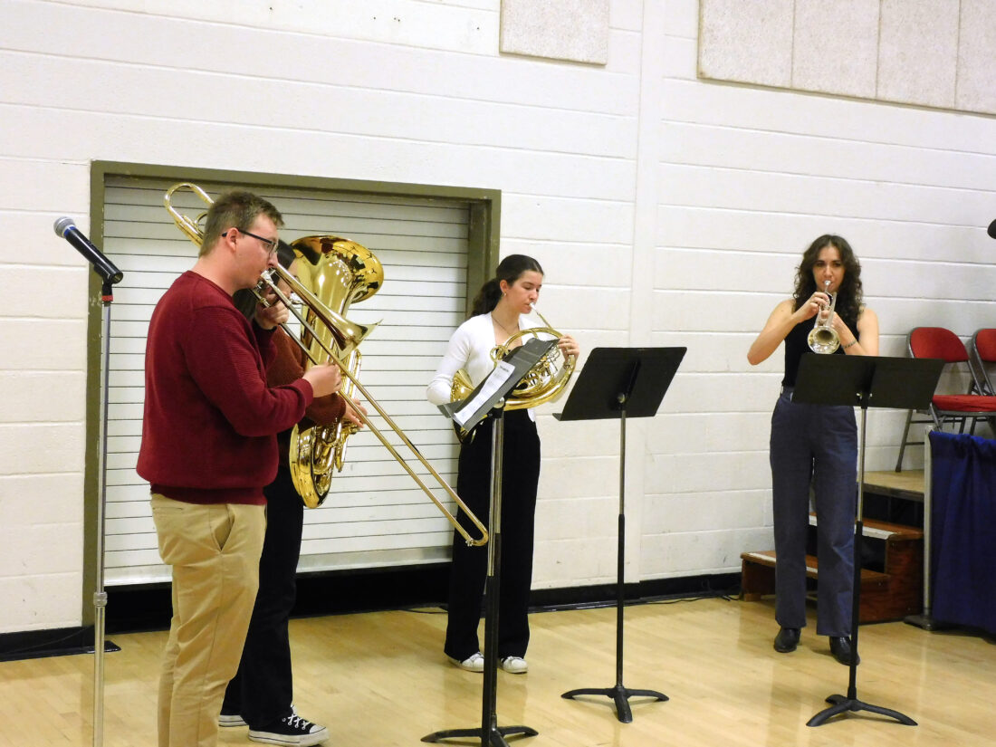 Charles Crane/MDN Jarrett Howe, Lia Butz, Hope Gravley and Kaylee Capp of the Our Redeemer’s Brass Quartet perform at the Minot Veterans Day program Tuesday, Nov. 11.